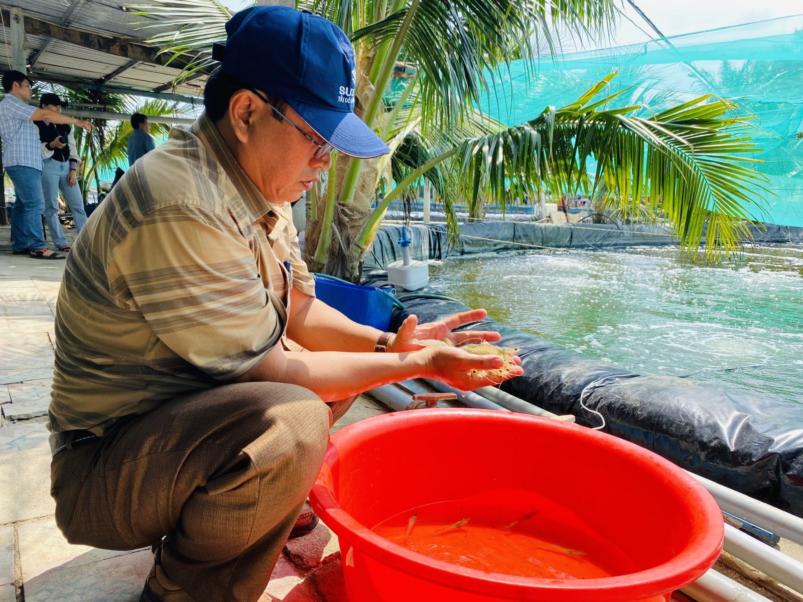 Thạc sỹ Trần Quang Nhựt, Phó Giám đốc Trung tâm Khuyến nông, kiểm tra tôm thương phẩm. Ảnh - TTKN