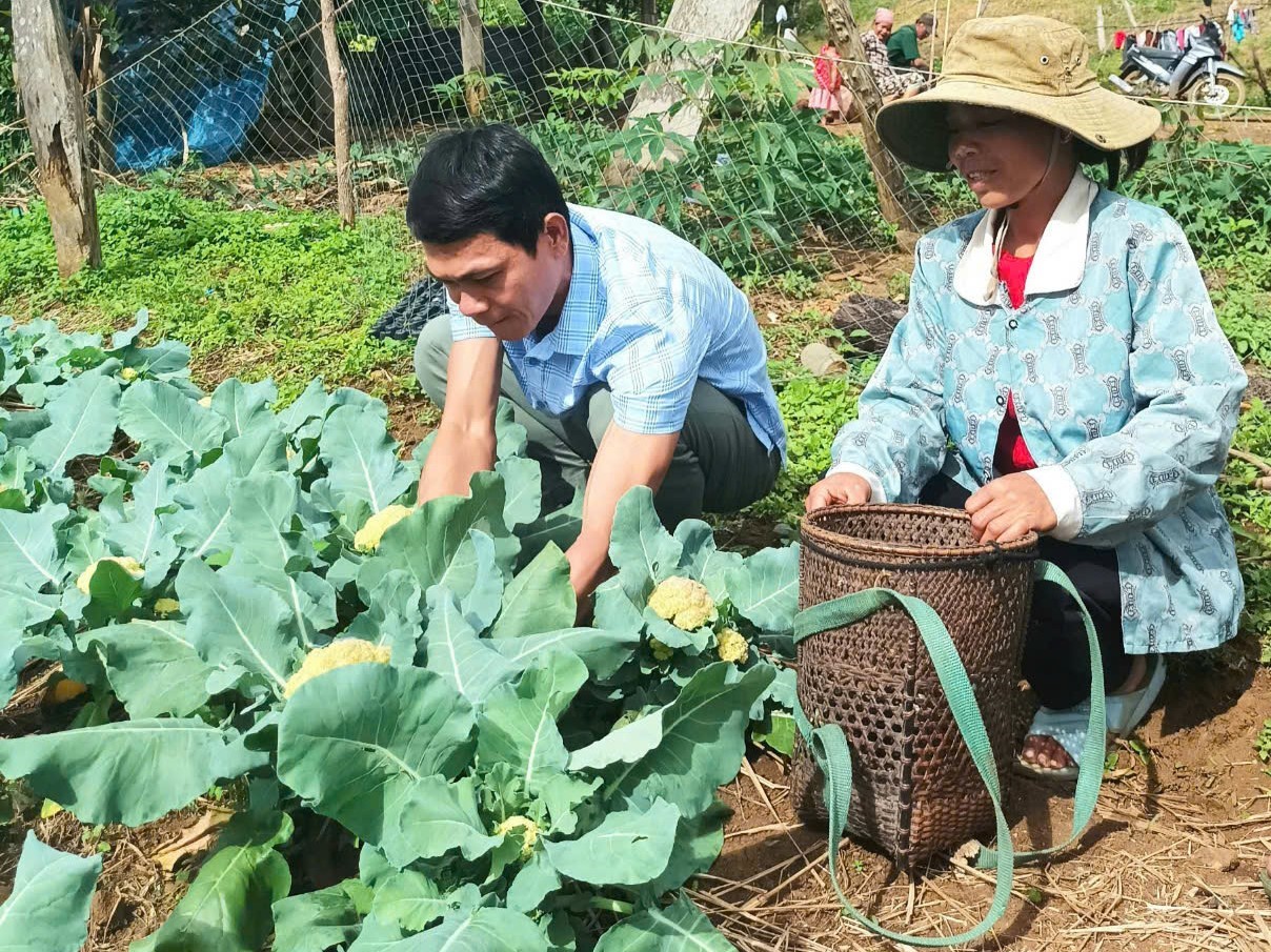 Cán bộ kỹ thuật Trung tâm Khuyến nông hướng dẫn chị Ni Na thu hoạch. Ảnh - Nguyễn Cường