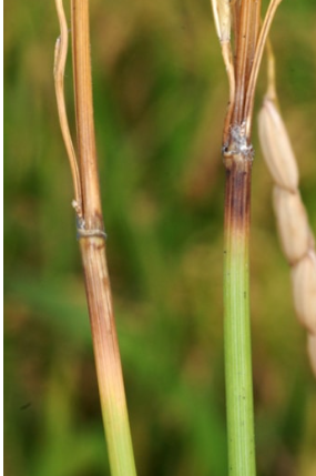 - Trên đốt thân: Vết bệnh màu nâu bao quanh đốt thân làm đốt khô, teo lại. Các đốt thân gần gốc bị mục ra làm cho gốc bị gãy đổ.