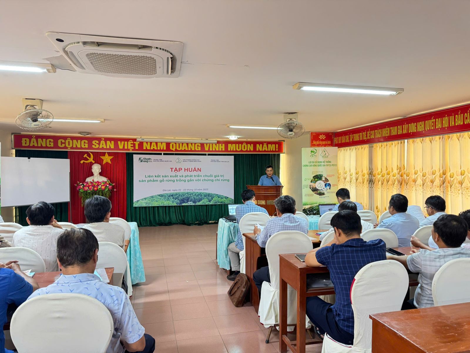 Liên kết sản xuất và phát triển chuỗi giá trị sản phẩm gỗ rừng trồng gắn với chứng chỉ rừngTrong ba ngày (01-03/10/2025), Trung tâm Khuyến nông phối hợp với Văn phòng Chứng chỉ quản lý rừng bền vững tổ chức lớp tập huấn “Liên kết sản xuất và phát triển chuỗi giá trị sản phẩm gỗ rừng trồng gắn với chứng chỉ rừng” cho 30 học viên là cán bộ phòng kinh tế, nông dân và hợp tác xã của 12 xã, phường phía Đông của tỉnh Gia Lai. |