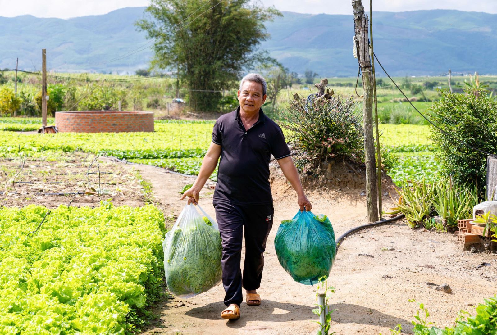 Ông Phan Văn Dũng phấn khởi với mô hình trình diễn hệ thống tưới tiết kiệm trên các loại rau. Ảnh:TTKN