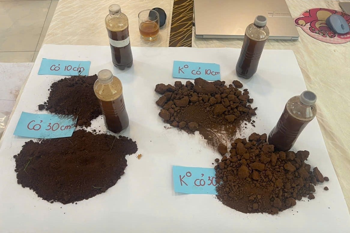 Học viên thực hành lấy mẫu đất ở tầng đất 0-10 cm và tầng 10-30 cm xem để xem kết cấu đất nén hay xốp, đánh giá độ mùn của đất bằng cảm quan
